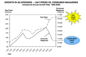 Gay-Specific Advertising Rises To Record LevelsGay-specific adverting in the gay press hit a record high last year, according to the 2009 Gay Press Report, an annual survey of advertising in the gay media. Advertising that directly portrays gay and lesbian consumers and their lives in LGBT publications hit an all-time high of 61.9%, the survey reported. In 2002, only 9.9% of all ads were gay-specific. “We continue to find that gay-specific advertising is by far the most effective with this audience, producing the biggest return on investment,” said Howard Buford, CEO and founder of Prime Access, the New York-based advertising firm, which, along with media firm Rivendell Media, has produced the report since 1999. The report also found that spending in the gay press jumped to an all-time high of $349.6 million last year, up from $307.7 million in 2008. Revenues have grown 377% since 1996. During three years early in the decade – 2001 to 2003 – spending in the gay press contracted, with the largest decreased coming in 2003, which saw a 17.8% drop. Growth failed to reach double digits from 2005 to 2007. Last year's growth comes as the media industry faced one of its toughest years, with revenues for consumer magazines down 15.6% over the same time period – its lowest point since 1998. “The numbers do not lie, and even I was surprised at how gay media held its own in such a tough market,” Todd Evans, president and CEO of Rivendell Media, said. “Gay media sales have always doubled in past recessions as companies focus their media on their best customers. While we didn't see that kind of increase this year, the numbers are still significant.”