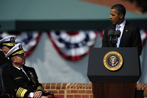 Obama made his remarks during a hail and farewell ceremony at Fort Myer in Arlington, Virginia in which Mullen's responsibilities as chairman of the Joint Chiefs of Staff were transferred to Army General Martin E. Dempsey.