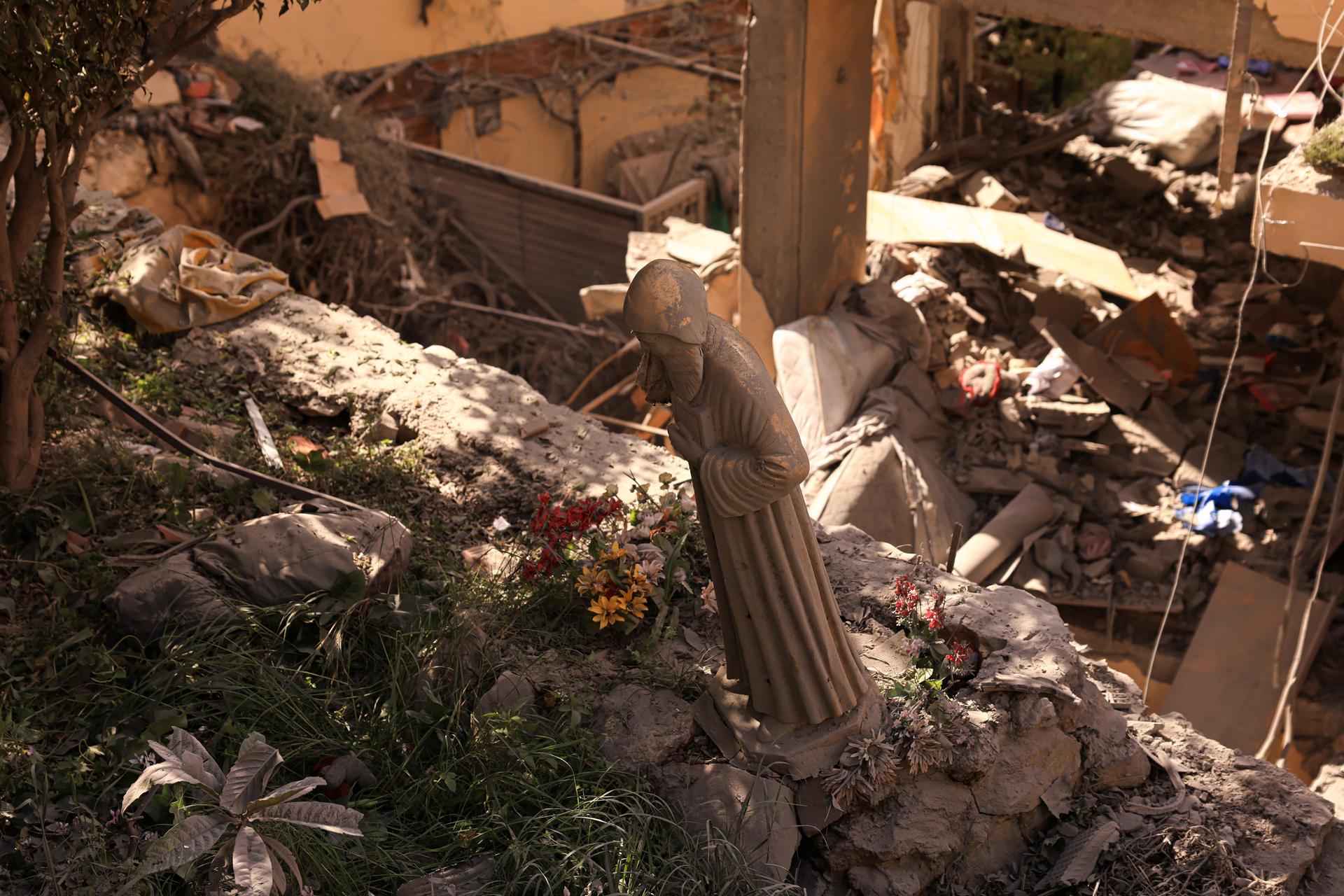 A statue of Lebanese saint Charbel Makhlouf at the site of an Israeli strike in Ain Saadeh, Lebanon. REUTERS/Raghed Waked |